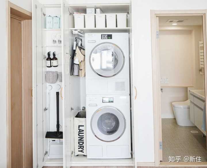 打開(kāi)柜門才會(huì)發(fā)現(xiàn),連洗衣機(jī)、烘干機(jī)全都能藏進(jìn)去。