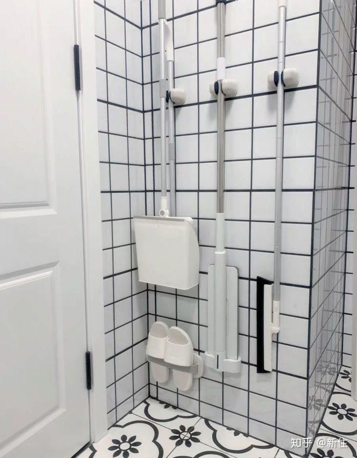 對(duì)于家里沒(méi)清潔工具柜,想要整潔也是有方法的,可以通過(guò)拖把掛鉤來(lái)壁掛在衛(wèi)生間門后收納。