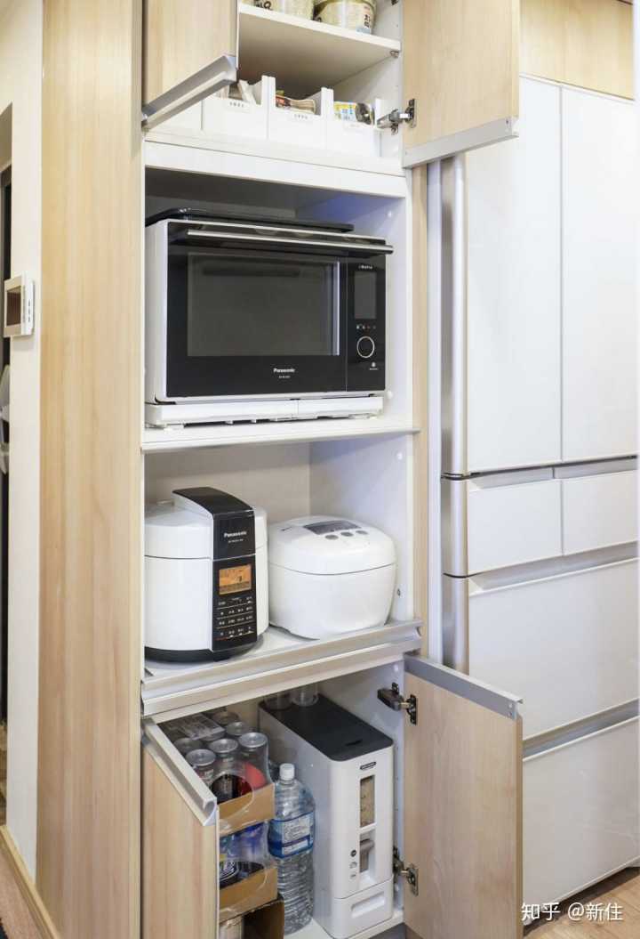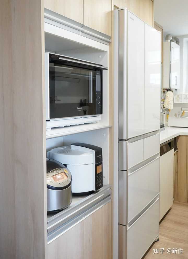 如果廚房空間足夠,定制高柜是不錯(cuò)的方式,可以把常用小家電都收納起來(lái)不說(shuō),還非常方便使用。